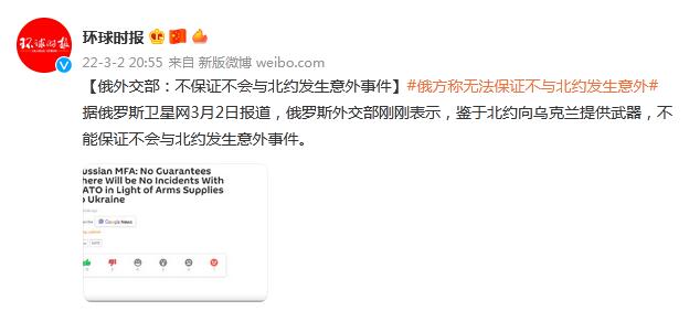 【俄外交部:不保证不会与北约发生意外事件】#俄方称无法保证不与北约发生意外# 据俄罗斯卫星网3月2日报道,俄罗斯外交部刚刚表示,鉴于北约向乌克兰提供武器,不能保证不会与北约发生意外事件。
