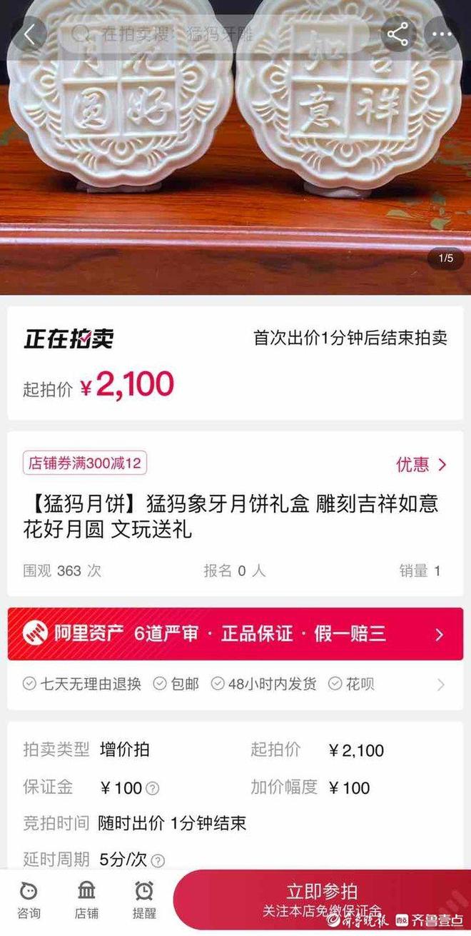 记者在淘宝网搜索发现,有一对跟上述猛犸月饼外观及规格相同的商品在拍卖,起拍价为2100元,保证金100元,加价幅度100元。