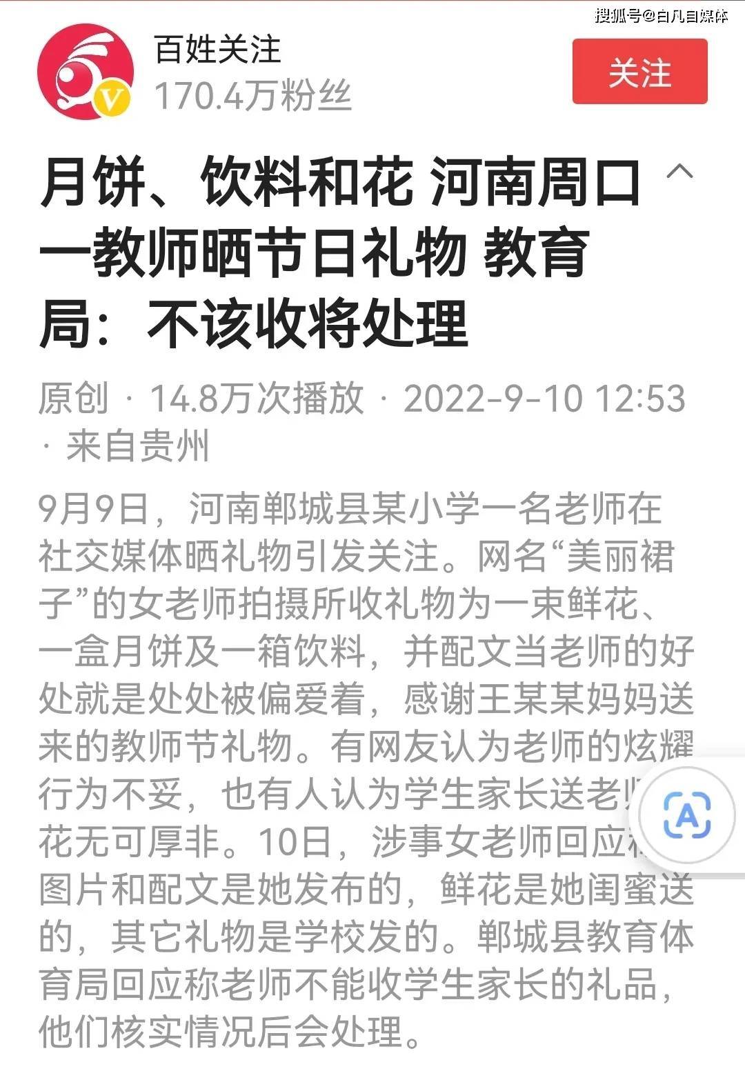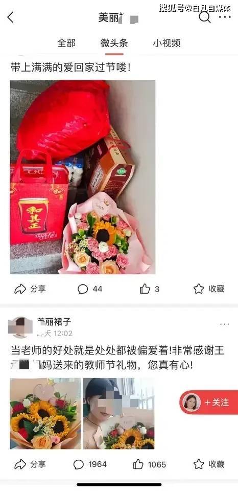 现在她说这些礼物是学校给教师节准备的,花是她闺蜜送的。这样,查一下就知道了,看学校有没有发这些福利就清楚了。花很可能是学生家长送的,她的“闺房”可能指的是学生家长。说她在教师节收到一束花,也是可以理解的。只要她和学生家长关系好,不是因为职业问题,或者为了照顾学生,那也无可厚非。但是当她这样一晒出来的时候,那就说不清楚了。你们,说呢?