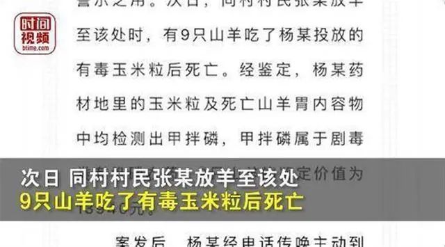 据报道,2021年2月,杨某因自家药材地经常被羊群踩踏、啃食,拿出农药浸泡过的玉米粒撒地里。杨某在药材地的东西两侧,各放置了写有“小心有毒”的纸箱片作警示。次日,同村村民张某放羊至该处,9只山羊吃了有毒玉米粒后死亡。