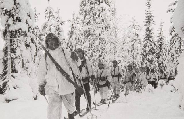 芬军则大多习惯于这种气候,他们一层一层地穿着厚内衣、毛线衣、长裤和野战茄克,再罩上用床单做的伪装服。远远看去,芬军滑雪巡逻队中披斗篷戴头罩的士兵很像美国的三K党徒。他们经常用汽油和枪油混合物擦拭武器,没有防冻油时,就使用机枪冷却装置里的酒精和甘油,以免武器上冻,使武器处于随时都可使用的状态。