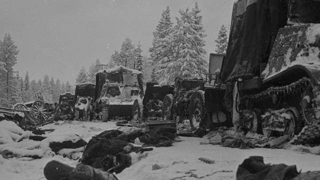 战斗就这样从早上持续到傍晚。在芬军防线的前方和后方,几十辆被击毁的坦克,几千具冻僵了的尸体静卧在雪地里,有些是成堆的,有些是成长列的,像被推倒的多米诺骨牌。在芬军士兵收集阵亡苏军的枪械时,这些奇形怪状的僵尸和战车很快被一场新下的雪掩埋了。