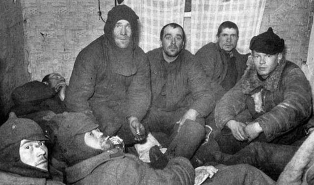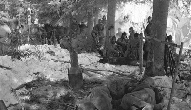 在芬兰丛林中休息的苏军,近处是两个刚冻死的苏军尸体