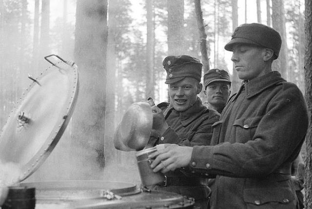1939年10月10日,接受动员训练的芬兰士兵正在野战餐车附近准备午餐