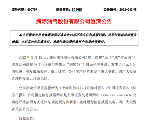 ST洲际也发布澄清公告,9月12日,公司注意到网络报道,截止目前,公司生产经营未发生重大变化。请广大投资者理性投资,注意风险。