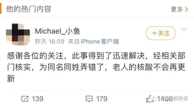 据上海辟谣平台微信公号,9月12日,网民“Micheael_小鱼”发帖称家中老人于2022年8月3日去世,却发现老人的核酸报告还在不断更新。上海辟谣平台注意到,当天下午该网民已删除原帖,并更新状态表示“感谢各位的关注,此事得到了迅速解决,经相关部门核实,为同名同姓弄错了,老人的核酸不会再更新”。
