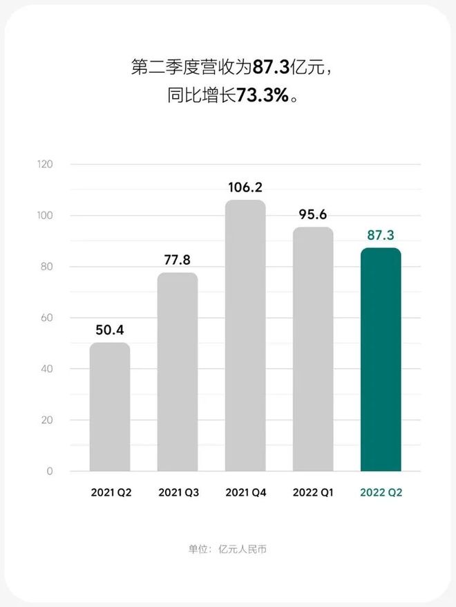 根据理想汽车发布的第二季度财报,其实现营收87.3亿元,较2021年第二季度的50.4亿元同比增加73.3%,较2022年第一季度的95.6亿元环比减少8.7%。净亏损为6.41亿元,较2021年第二季度的2.36亿元扩大172.2%,而2022年第一季度净亏损为1090万元。
