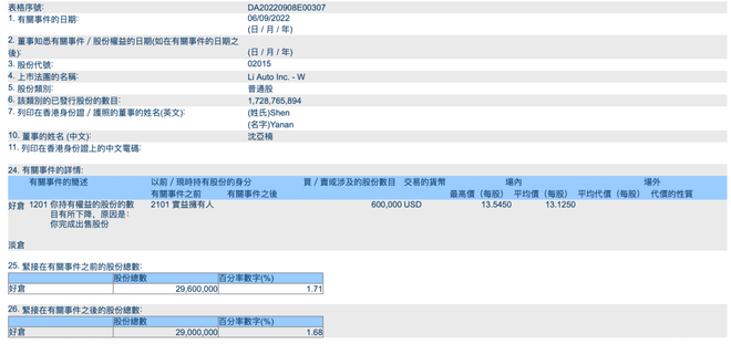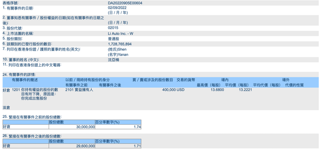 9月9日,港交所网站显示,理想汽车执行董事兼总裁沈亚楠于9月6日卖出理想汽车港股60万股,均价13.125美元。持股比例由1.71%降至1.68%。以此计算,沈亚楠本次套现787.5万美元(约合人民币5451万元)。