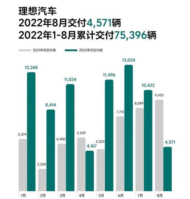 在销量方面, 理想汽车8月交 付腰斩,仅4571辆,同比及环比降幅都超50%; 2022年1月至8月,理想累计交付7.54万辆,同比增56.5%。