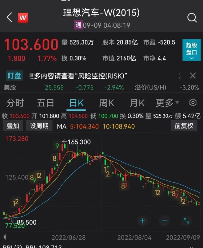 9月9日收盘,理想汽车涨1.77%,报收103.6港元,市值2160亿港元。