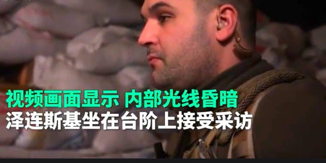画面显示,内部光线昏暗,泽连斯基坐在台阶上接受采访,身后就是成堆的沙袋状物体,还有人全副武装持枪守卫。