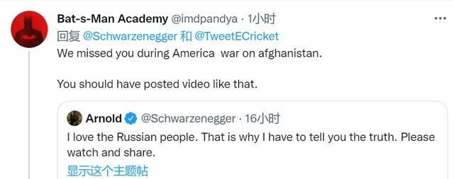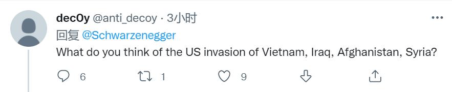 还有网友提醒施瓦辛格,美国那些年曾发动的一系列战争:“你应该(在阿富汗战争时)也发一个这样的视频。”“那你怎么看美国入侵越南、伊拉克、阿富汗、叙利亚的事?”↓