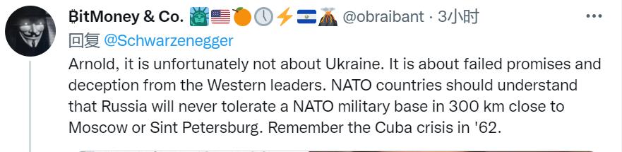 有网友在他的这段视频下回复,点出俄罗斯的处境:“阿诺德,很不幸这(战争)不是关于乌克兰,而是关于西方领导人失败的承诺和欺骗。北约国家应该理解俄罗斯不会容忍北约的军事基地仅距莫斯科或者圣彼得堡300公里吧。别忘了1962年的古巴导弹危机。”↓