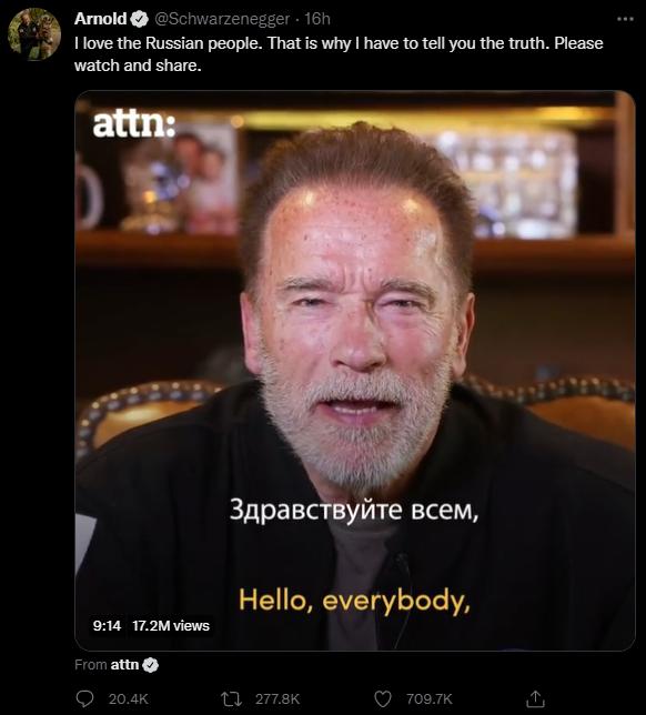 在视频末尾,施瓦辛格控诉俄罗斯政府是在向俄民众和士兵“撒谎”,并在最后向普京呼吁:“你发动了这场战争。你在指挥这场战争。你可以停止这场战争”。