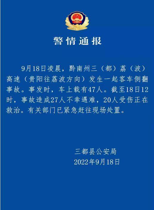 9月18日凌晨,黔南州三(都)荔(波)高速(贵阳往荔波方向)发生一起客车侧翻事故。事发时,车上载有47人。截至18日12时,事故造成27人不幸遇难,20人受伤正在救治。有关部门已紧急赶往现场处置。