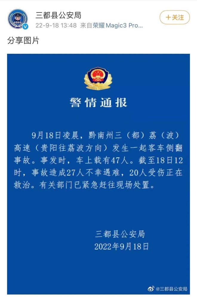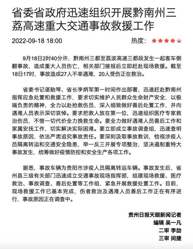 9月18日2时40分许,黔南州三都至荔波高速三都段发生一起客车侧翻事故,截至18日22时,事故造成27人不幸遇难,20人受伤正在救治。此次事故涉事车辆系抗疫转运征用车辆,从云岩区接送涉疫隔离人员前往黔南州荔波县隔离酒店进行集中隔离医学观察。车上载有47名人员,其中驾驶员1名,随车工作人员1名,其余45人均为云岩区涉疫居民。