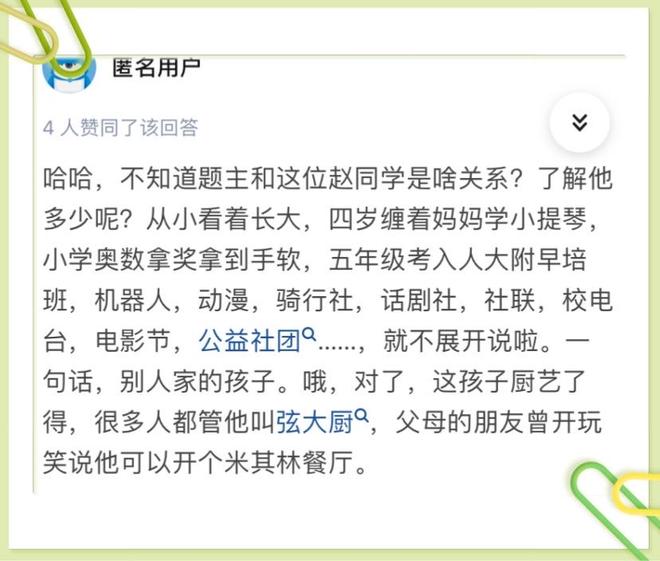 网友爆料赵导四岁开始学小提琴,小学奥数拿奖拿到手软,五年级考入人大附早培班,机器人,动漫,骑行社,话剧社,社联,校电台,电影节,公益社团等等,典型的“别人家的孩子”。