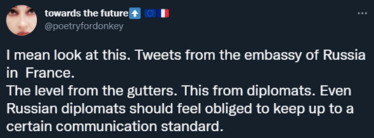 在网络上,也有一些人批评讽刺画,有人抨击称,“来看看这个。俄罗斯驻法国大使馆的推文。(可以被形容为)排水沟的水准。这画来自外交官。即使是俄罗斯的外交官也应该有义务保持一定的交流水准。”