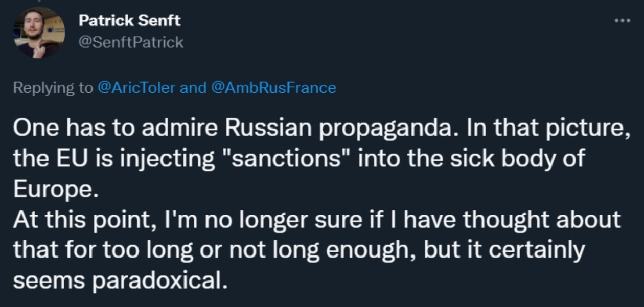 还有人评论说,“人们不得不佩服俄罗斯的宣传。在那张讽刺画中,欧盟正在向欧洲生病的身体注入‘制裁’。这时,我已经不知道自己是想得太久还是不够久了,这(欧盟的做法)确实显得很矛盾。”