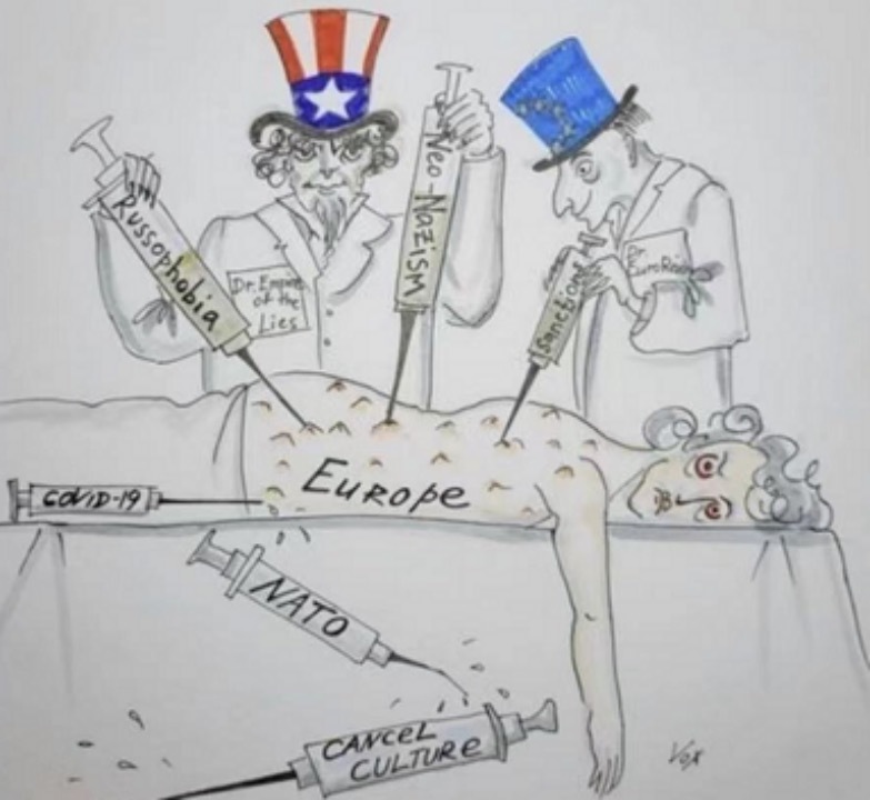 俄驻法大使馆24日推文中附上的讽刺画之一据法新社描述说,俄驻法大使馆24日发了两条讽刺画推文:在一条写有“欧洲团结行动”的俄驻法大使馆推文中,一排以欧盟成员国标识出现的人物形象跪成一排,在舔一个头戴美国国旗图案帽子的山姆大叔的光屁股。而在另一条推文中,可以看到两名穿着白大褂、戴着印有美国和欧盟标志帽子的人物,用标有“恐俄症”、“新纳粹主义”、“制裁”以及“取消文化”和“新冠病毒”的注射器,给一个看起来变成僵尸的“欧洲”人物形象打针。