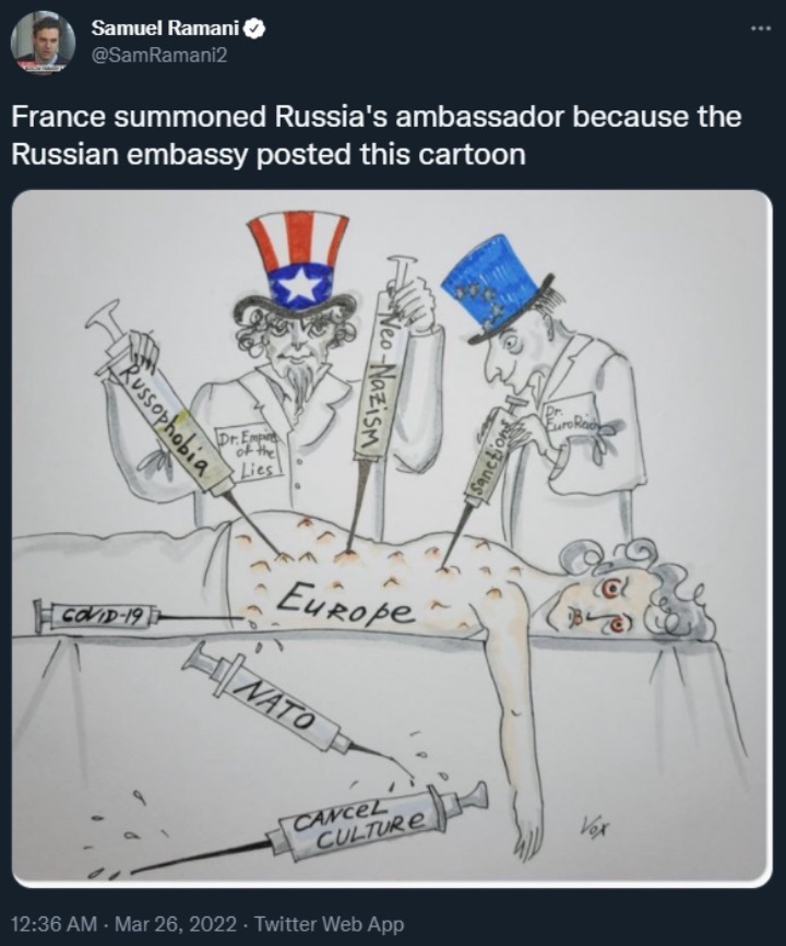 塞缪尔·拉马尼:因为俄使馆发的这幅卡通画,法国召唤俄大使抗议针对这幅讽刺画,有人在评论栏中指责称,“无论如何,所有俄罗斯大使馆都应该被关闭。”