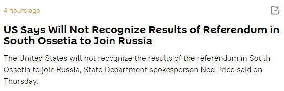 报道称,被问及美国务院在南奥塞梯公投上的立场时,该部门发言人内德·普莱斯称,“(南奥塞梯)事实上的政府和俄罗斯政府都无权决定南奥塞梯的未来,该地区是格鲁吉亚的一部分。”