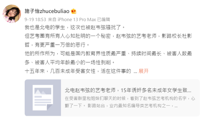 施子怡近日在互联网发文,举报北电性丑闻。(微博截图)