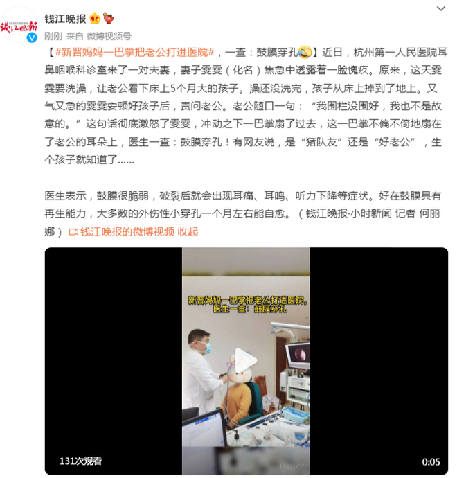 近日,杭州第一人民医院耳鼻咽喉科诊室来了一对夫妻,妻子雯雯(化名)焦急中透露着一脸愧疚。原来,这天雯雯要洗澡,让老公看下床上5个月大的孩子。澡还没洗完,孩子从床上掉到了地上。又气又急的雯雯安顿好孩子后,责问老公。老公随口一句:“我围栏没围好,我也不是故意的。”这句话彻底激怒了雯雯,冲动之下一巴掌扇了过去,这一巴掌不偏不倚地扇在了老公的耳朵上,医生一查:鼓膜穿孔!有网友说,是“猪队友”还是“好老公”,生个孩子就知道了……