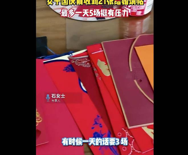 当事人石女士称这些请帖从这个月16号开始收,共收到21份。石女士称这些都是同事、朋友和同学的结婚请帖,最多的一天要参加5场婚礼,太远赶不过去的也没办法。石女士表示平均一天需要参加3场婚礼,而每场婚礼需要300或者500甚至800元礼金,真的是很有压力。