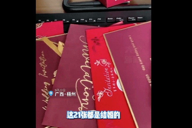 9月23日,在广西梧州,一女子国庆前夕收到21份结婚请帖的视频走红网络。