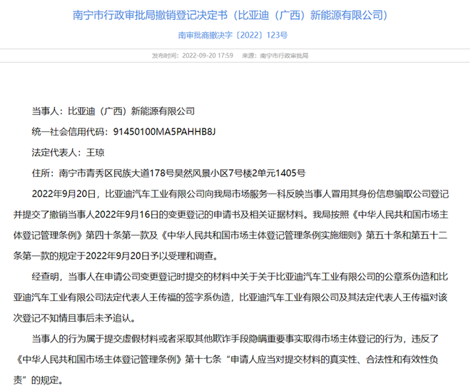 《南宁市行政审批局撤销登记决定书(比亚迪(广西)新能源有限公司)》显示:2022年9月20日,比亚迪汽车工业有限公司向我局市场服务一科反映当事人冒用其身份信息骗取公司登记并提交了撤销当事人2022年9月16日的变更登记的申请书及相关证据材料。我局按照《中华人民共和国市场主体登记管理条例》第四十条第一款及《中华人民共和国市场主体登记管理条例实施细则》第五十条和第五十二条第一款的规定于2022年9月20日予以受理和调查。