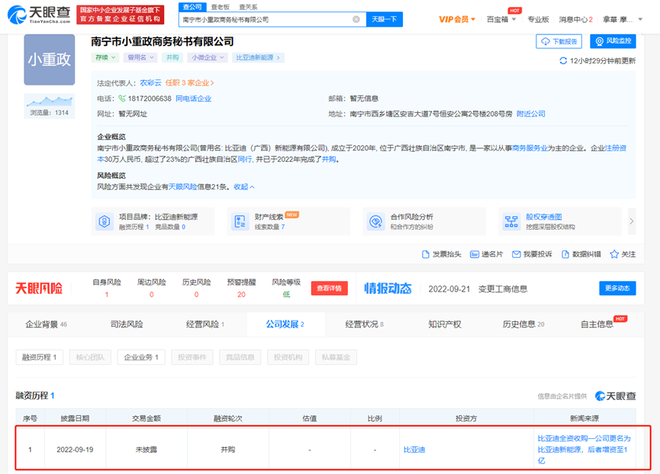财联社9月25日讯(编辑 陆鹿)近日,有消息称,比亚迪旗下子公司全资收购了南宁市小重政商务秘书有限公司,公司更名为比亚迪(广西)新能源有限公司,且注册资本由30万元增加至1亿元。