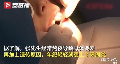 【男子常熬夜加重牙周炎致牙齿掉光】杭州40岁的张先生一直戴着活动假牙,早在四、五年前,他的牙齿就基本掉光。经了解,张先生长期熬夜导致身体变差,再加上遗传原因患上了牙周炎。医生介绍,牙周炎及时治疗不至于恶化,但如果经常熬夜、生活无规律会加速病程,三、四十岁就掉光牙齿的患者并不少见。