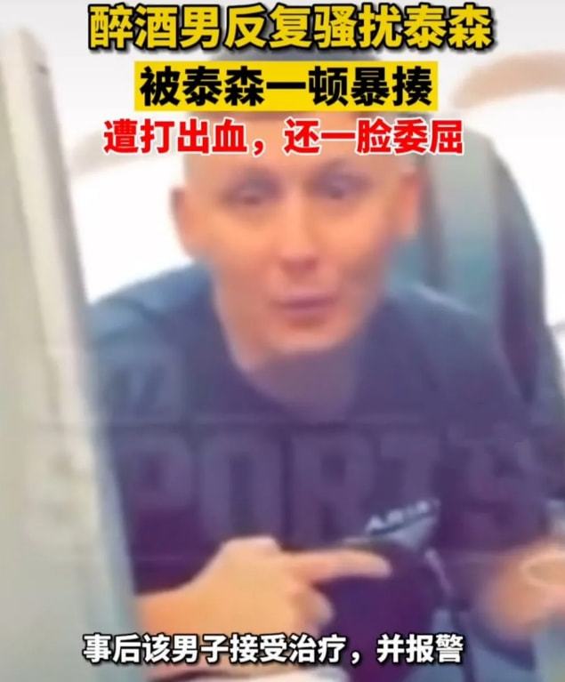 随后,这名男子一直在骚扰泰森,还疑似朝他扔水瓶,最终泰森忍无可忍动手暴打了对方。事后,该男子还一脸委屈地向人们展示自己的伤势。