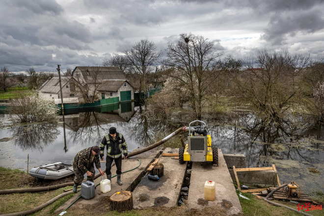 ▲抽水水泵所需的柴油只能靠橡皮船运送,德米迪夫村的排水清理工作预计还将需要几周甚至几个月的时间