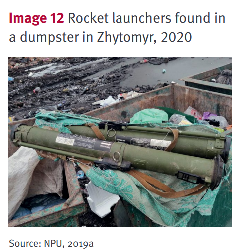 ↑乌克兰安全官员2020年在日托米尔的一个垃圾箱中发现了一个火箭发射器据乌克兰国家新闻社报道,2019年,两名乌克兰士兵试图以7.5万乌克兰格里夫纳出售40枚手榴弹、15枚火箭弹以及逾2000个枪支弹药。根据2021年发布的《小型武器调查报告》,2019年,乌克兰国家警察在赫梅利尼茨基的一个村庄发现185枚手榴弹和至少30个装有手榴弹引信的金属罐。次年,乌克兰安全官员在日托米尔的一个垃圾箱中发现了一个火箭发射器。2020年,乌克兰安全官员在敖德萨附近的一个电力设施中发现了约30枚手榴弹和2枚反坦克地雷,据悉这些武器是一名乌克兰军人从军事基地偷来的,这名军人在被捕前至少出售了两枚手榴弹。《小型武器调查报告》研究人员分析称,尽管乌克兰当局几乎每天都在缴获非法弹药,但松散武器的绝对数量使得其执法工作相形见绌,该国平民甚至其他欧洲国家仍面临非法武器带来的安全风险。