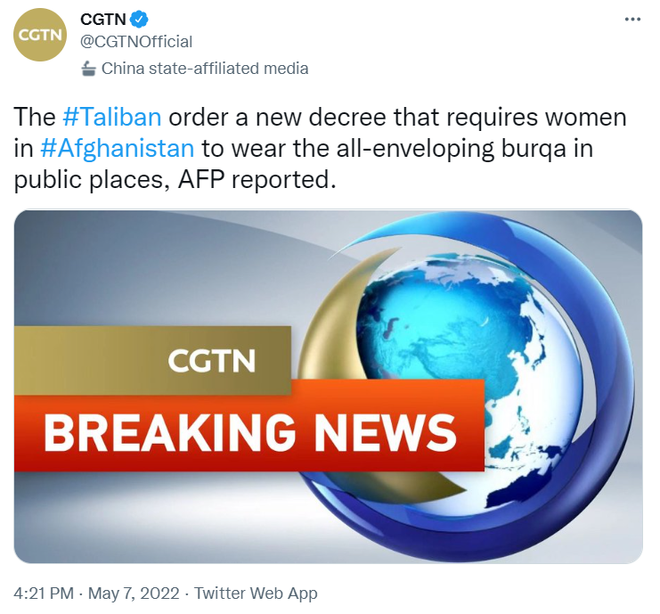 中国国际电视台(CGTN)5月7日消息,据法新社报道,塔利班颁布新法令,要求阿富汗女性在公共场所身穿布卡罩袍。