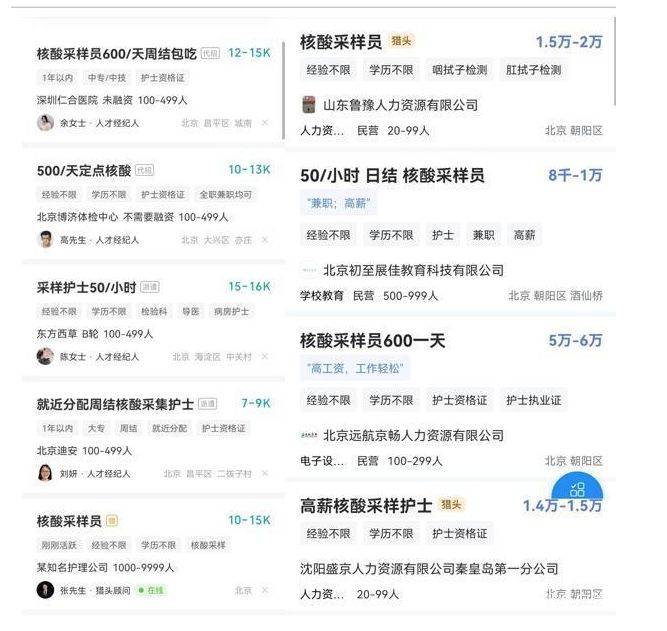 人民日报健康客户端在某招聘网站上检索核酸采样、采样护士发现,从5月12日至5月14日,包括医学检验公司、人力资源公司、私立医院在内的80余家用人单位发布了招聘信息。天津、青岛、西安、武汉、南昌、宁波、成都、沈阳、新疆等地都在招收核酸采样人员。