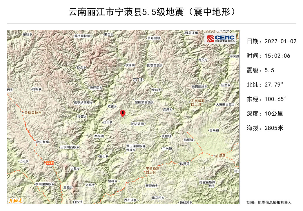 据中国地震台网速报消息,云南宁蒗5.5级地震,震中位于泸沽湖附近,距离最近的拉伯乡20公里,距宁蒗县城60公里,距香格里拉94公里,距丽江112公里,距昆明368公里。???