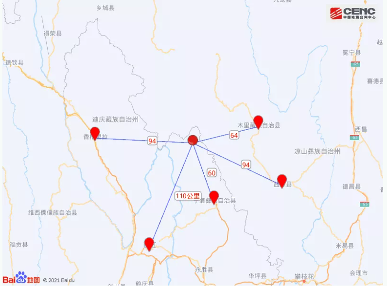周边县城:震中距宁蒗彝族自治县60公里、距四川木里藏族自治县64公里、距香格里拉市89公里、距四川盐源县94公里、距古城区110公里,距迪庆藏族自治州93公里,距昆明市368公里。