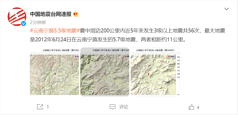 此外,震中周边200公里内近5年来发生3级以上地震共56次,最大地震是2012年6月24日在云南宁蒗发生的5.7级地震,两者相距约11公里。???