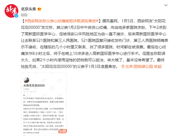 1月5日,西安网友“太阳花花花00000”发文称,其父亲1月2日中午突发心绞痛,向当地多家医院求助,下午2点到了高新国际医学中心,但被保安以中风险地区为由一直不接诊,后来高新国际医学中心让去联系521医院和第三人民医院,521医院回复只接收发热门诊,第三人民医院明确表示不接收,在随后的几个小时里又联系、找了很多医院,时间都在被浪费。最后在心绞痛发作8小时之后,终于在晚上10点多进入高新国际医学中心进行手术。但医生称耽误太久,如果2个小时内使用溶栓的药物就可以救治,来太晚了,基本没有希望了。最终抢救无效,“太阳花花花00000”的父亲于1月3日凌晨离世。