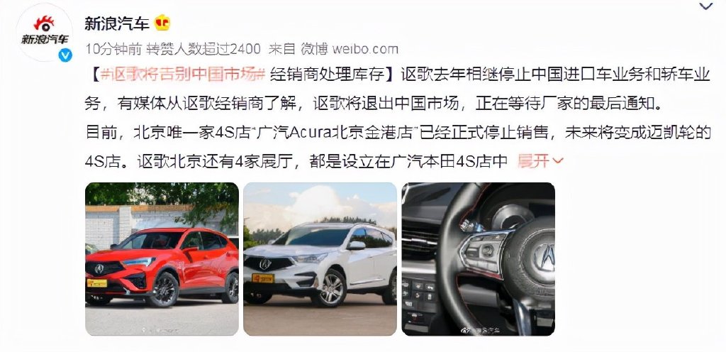目前,继停止中国进口车业务和轿车业务后,有媒体从经销商处了解到,讴歌将退出中国市场,目前他们正在等待厂家的最后通知。目前,北京唯一家4S店“广汽Acura北京金港店”已经正式停止销售,设在广汽本田的展厅在消化库存,已经无法预定新车,广汽讴歌厂家的工厂已经停产了。