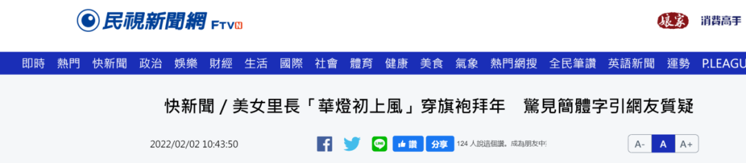 据台湾“ETtoday新闻云”等台媒消息,被称岛内是“最美里长”的台中西区“公民里里长”(台湾的“里长”可以对应为大陆居委会主任)林京玲,在除夕(1月31日)于脸书发布一张身穿旗袍的拜年照,岛内绿媒“民视新闻网”则注意到林京玲照片上印有简体字“新年快乐”后开酸,并借亲绿网友之口声称“看到简体字很不爽”,对此林京玲则表示“单纯拜年,无任何政治意图,不会换掉照片!”