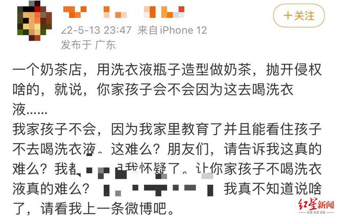 如此这款奶茶受热捧的情况下,也有网友认为,不是所有的新意都值得提倡,创新也要有底线,因为这种奶茶的容器外形酷似洗衣液,会不会误导孩子误食真的洗衣液?网友称“设计没有标准,但是有道德底线”,更有网友担心“孩子还没有判断力的时候,会觉得洗衣液是好喝的”“以后要是搞农药瓶出来就麻烦了”……