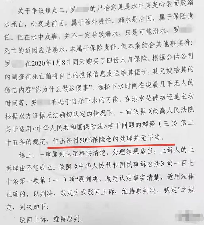 回到本案,小罗投保才半年就死亡了,如果其是自杀,就属于2年内自杀,保险公司可以拒赔。那么保险公司又通过什么认定小罗属于自杀呢?一是小罗短时间投保了4家保险公司,而且金额高达250万,太反常。二是小罗在半夜0时35分进入盘溪河路段,并在无人区域下水,不合常理。三是小罗曾在溺亡前一天,给亲属发送个人购买保险信息。综合以上信息,保险公司认为小罗是自杀的可能性很大,以此为由进行拒赔。