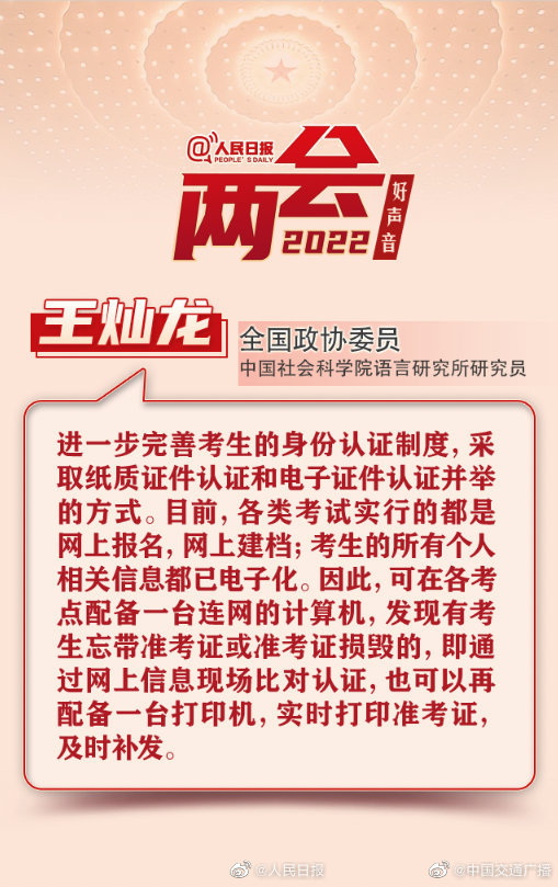 #2022两会早知道# 【#建议高考纸版电子版准考证并行认证#】中国社会科学院语言研究所研究员王灿龙委员建议:进一步完善考生的身份认证制度,采取纸质证件认证和电子证件认证并举的方式。目前,各类考试实行的都是网上报名,网上建档;考生的所有个人相关信息都已电子化。因此,可在各考点配备一台连网的计算机,发现有考生忘带准考证或准考证损毁的,即通过网上信息现场比对认证,也可以再配备一台打印机,实时打印准考证,及时补发。为了防止以上措施使考生松懈地对待考场纪律从而导致忘带、丢失或损毁准考证的情况大面积发生,可采取经济手段对这类考生予以惩戒,比如事后收取不低数额的现场查询、核对、打印等事务的费用,并给予通报批评。@人民日报