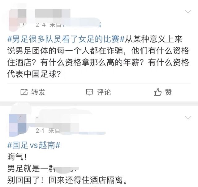 此外,前段时间男足的事情也是让网友们气愤不已。在比赛的过程中,男足一路连败,不少人都吐槽他们没有资格拿那么高的年薪,更没有资格代表中国足球。他们不仅是辜负了大家的期待,更是对不起一直以来所享受的好待遇。