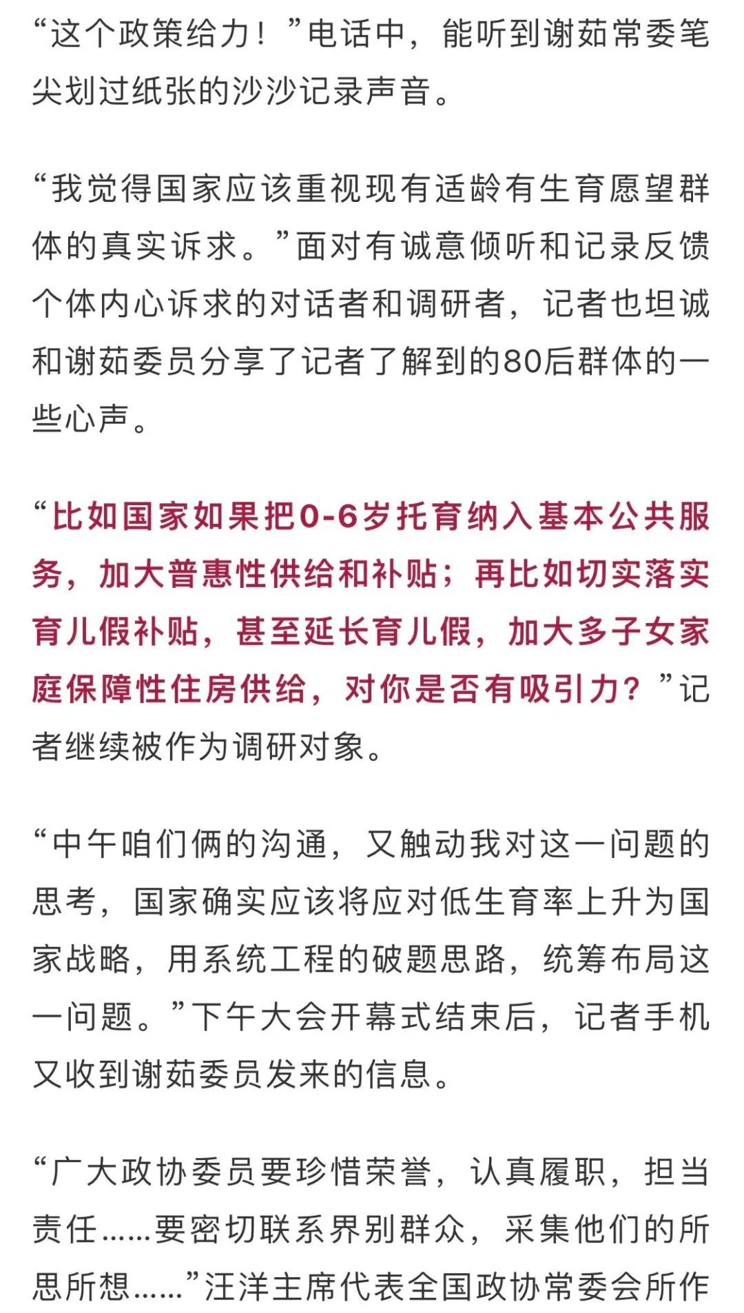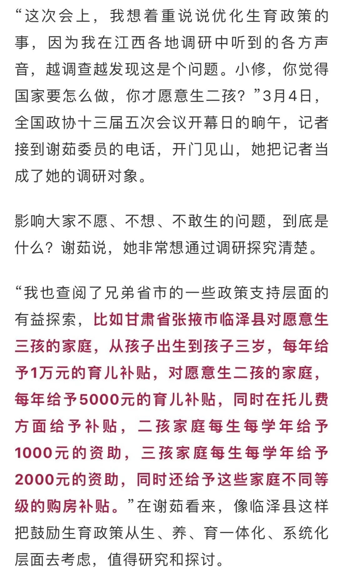 “小修,你觉得国家要怎么做,你才愿意生二胎?”3月4日,全国政协十三届五次会议开幕日的晌午,记者接到谢茹委员的电话,开门见山,她把记者当成了她的调研对象。
