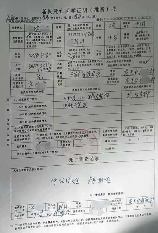 据“健康界”报道,医院出具的死亡医学证明(推断)书上显示:小婉君的直接死亡原因为“呼吸、心跳骤停”,引起疾病为“急性喉炎”。